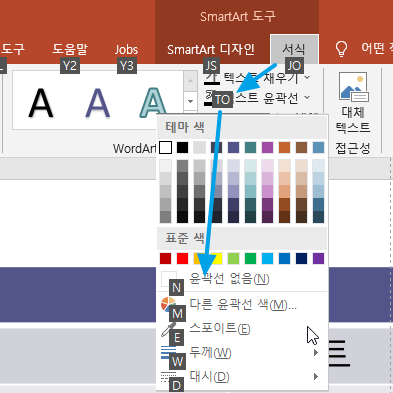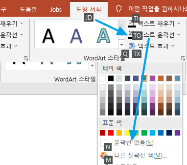 직접 도형이나 텍스트를 선택하고 윤곽선 '없음'을 선택하면 적용이 됩니다.