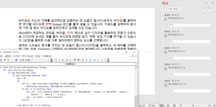 이제 F5를 누르거나 코드창을 닫고 Alt-F8로 AddMemo 매크로를 실행하세요.