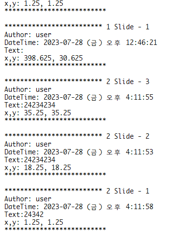 아래 코드는 모든 슬라이드의 메모를 Ctrl-G실행창에 출력해줍니다.
