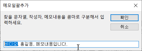 strUser = InputBox("찾을 문자열, 작성자, 메모내용을 콤마로 구분해서 입력하세요.", "메모일괄추가", strSearch & ", " & Author & ", " & Memo)