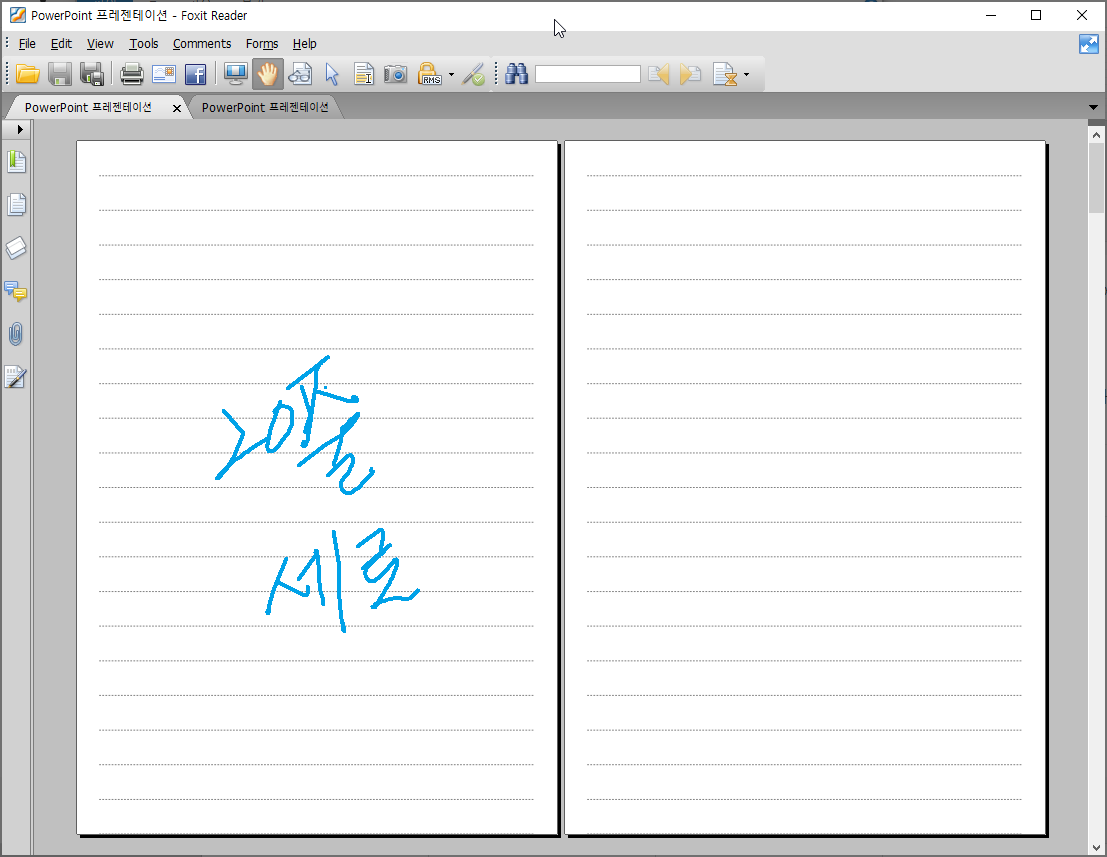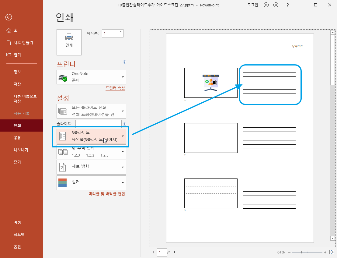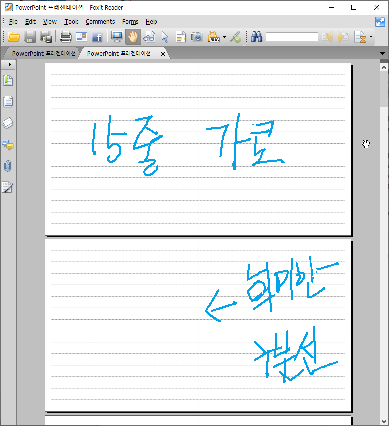특히 펜 기능이 있는 태블릿의 경우 ppt 빈줄을 띄워놓고 필기하게 되면 글씨가 비뚤어지지 않아서 유용합니다.