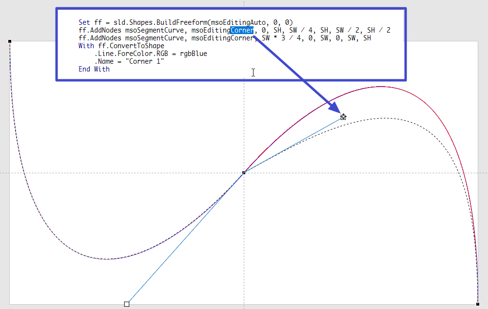 EditingType을 msoEditingSmooth 혹은 msoEditingCorner 나 msoEditingSymmetric 으로 하고 시작 제어점(조절점) 좌표를 슬라이드 왼쪽 아래 끝으로 지정하면 아래 빨간색 곡선처럼 더 아래로 휘어진 곡선이 그려집니다.
