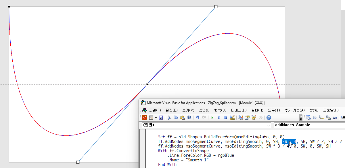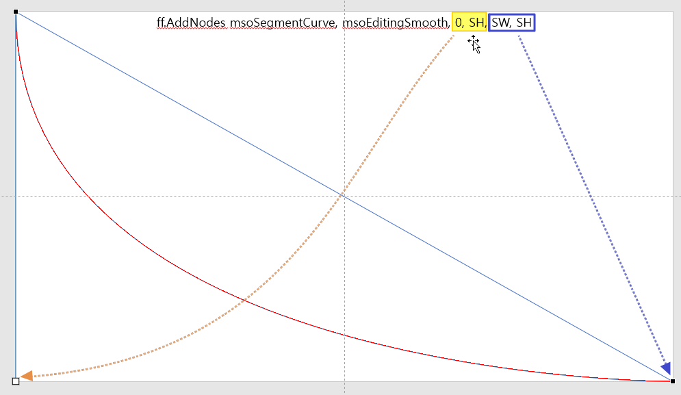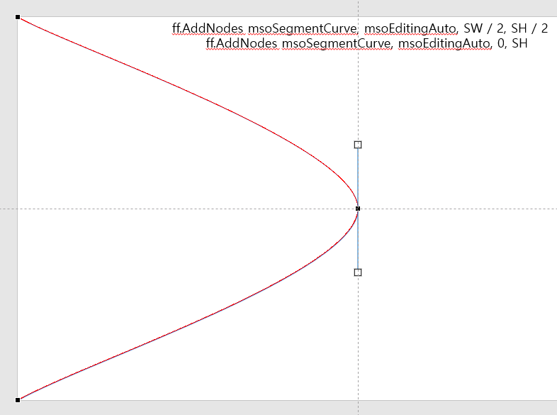이 때 아래 빨간 곡선의 경우 ff.AddNodes msoSegmentCurve, msoEditingCorner, 0, SH, SW, 0, SW, SH 로 조절점을 두 개 지정할 수 있습니다.