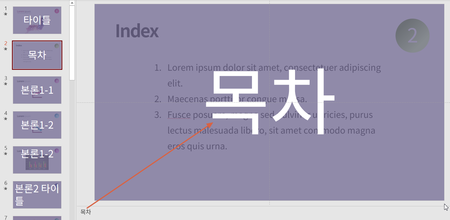 표시할 내용은 각 슬라이드의 슬라이드 노트 첫번째 줄에 작성해줍니다.