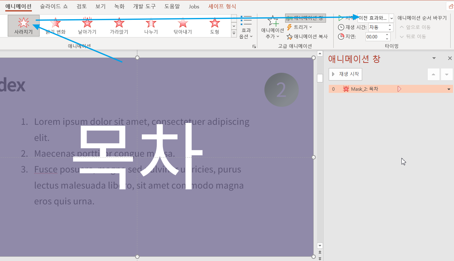 마스크 도형에 사라지기 애니메이션이 '이전효과와 함께' 로 적용되고 가장 첫번째 애니메이션으로 적용됩니다.