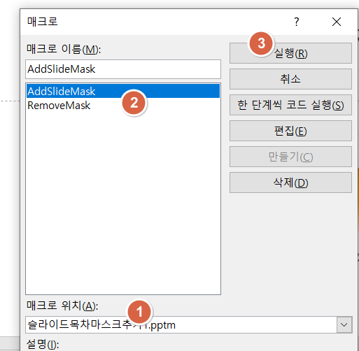 Alt+F8을 누르고 매크로 위치는 첨부한 pptm 을 선택하고