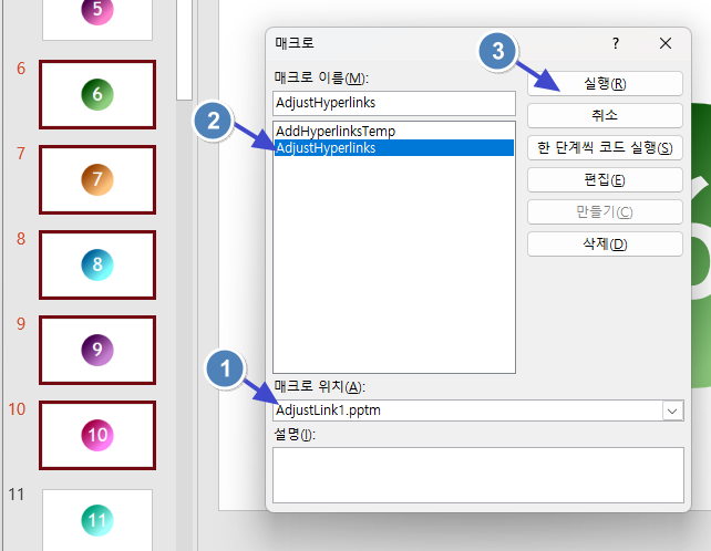 Alt+F8누르고 매크로 위치는 첨부파일로 선택하고 AdjustHyperlinksInSlides 를 실행합니다.
