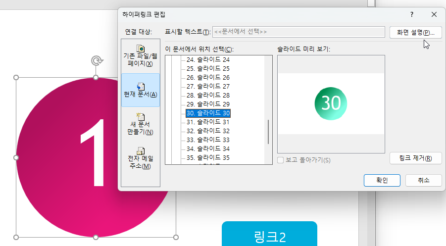 추가로 현재 슬라이드에서 선택한 도형들에 대해서만 하이퍼링크를 조절하고 싶다면