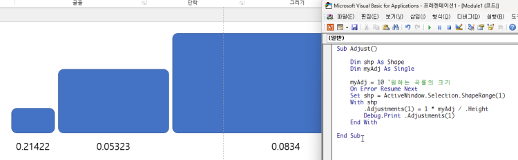 원하는 도형을 선택하고 Alt+F8로 Adjust매크로를 실행하면 지정된 크기에 맞춰서 곡률값을 계산해서 적용해 줍니다.
