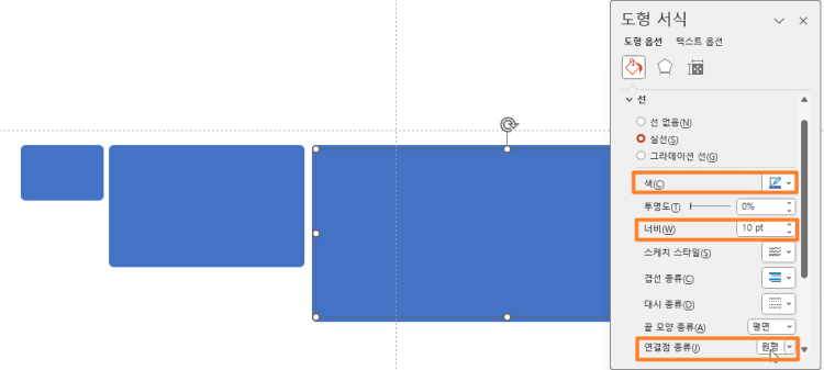 그리고 연결점의 종류를 '원형'으로 설정하고 선의 두께를 원하는 만큼 두껍게 설정하면