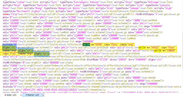 기본 속성는 테마파일 형태로 ppt/theme/theme1.xml 등에 들어 있습니다.