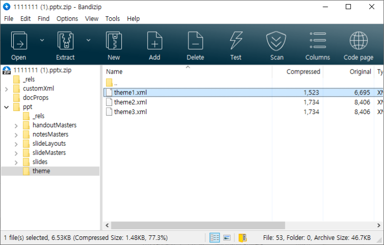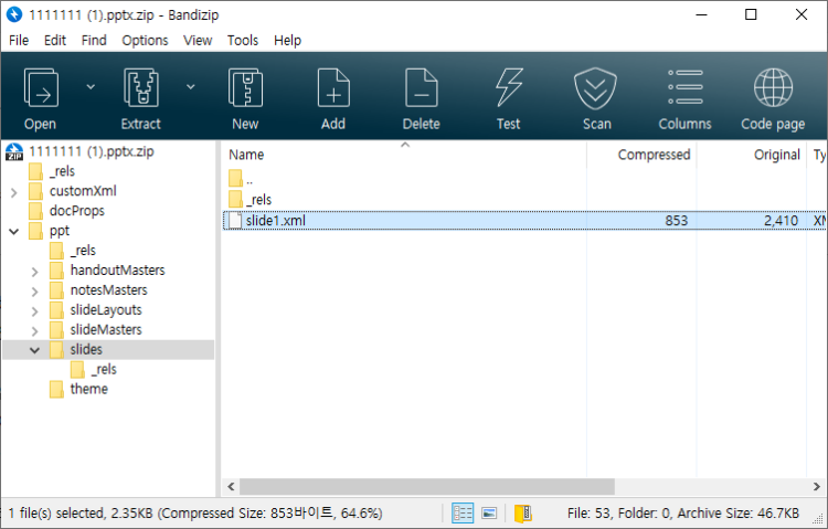 특히 pptx파일은 ZIP 압축파일 형식인데 내부에 XML파일형태로 슬라이드나 슬라이드 마스터, 그리고 테마 등이 들어 있습니다.