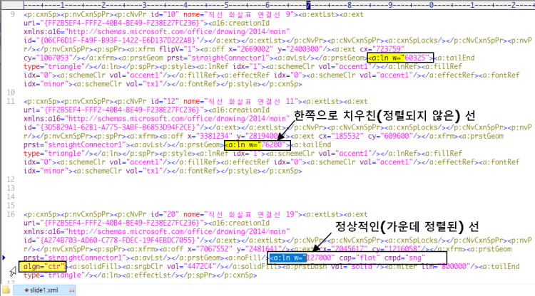 선이 한쪽으로 치우친 '직선화살표 연결선 11' 도 <a:ln="76200">에서 <a:ln="76200" algn="ctr"> 로 수정하면 선이 가운데로 정렬됩니다. cmpd="sng"는 선의 유형으로 single 선으로 보입니다.