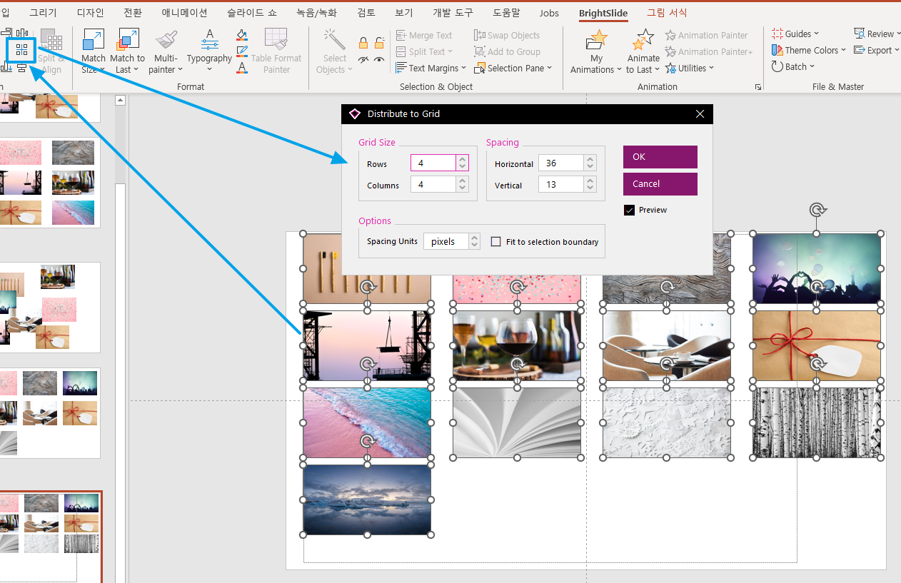 참고로 BrightSlide 라는 추가기능을 이용하면 위와 비슷하게 개체를 정렬시켜줄 수 있습니다.