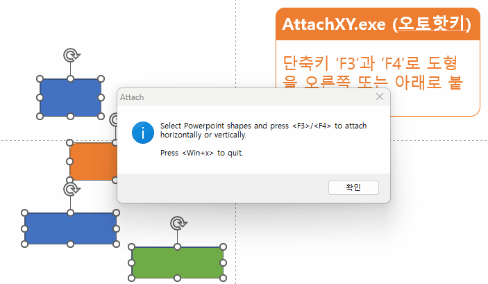 파워포인트 슬라이드에서 원하는 도형을 선택하고 F3을 누르면 좌우로 붙게되고 F4를 누르로 상하로 붙게됩니다.