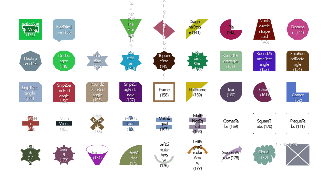 그래서 미리 정의된 도형이름 및 내부도형숫자(값)와 실질적인 도형모양을 직접 보여줄 수 있게 VBA로 정리해보았습니다.