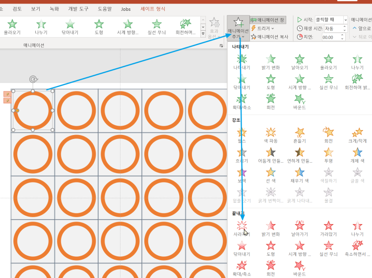 동그라미에 애니메이션 추가를 누르고(반드시 추가를 눌러야 기존 애니메이션이 사라지지 않습니다.)