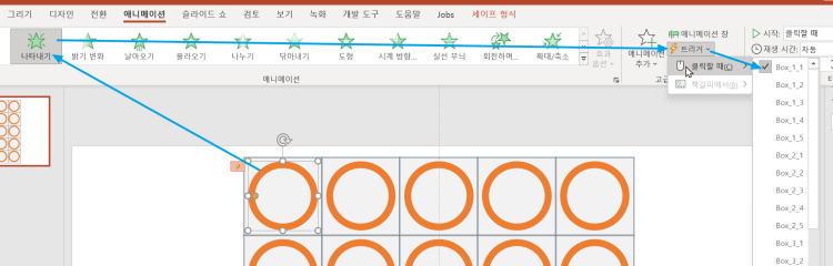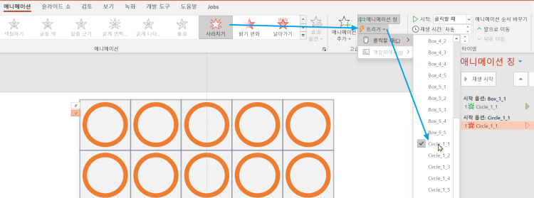 동그라미에 애니메이션은 나타나기트리거가 먼저 적용되고