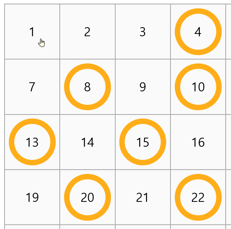 빙고표를 만들고 빙고칸을 클릭하면 동그라미 표시가 나타나게 하고 싶은 경우입니다.