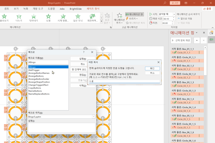 Alt+F8을 누르고 loadBingo를 실행해서 위와 같은 엑셀파일을 불러오면 Box_xx_x_y 도형에 해당 문구가 들어갑니다.