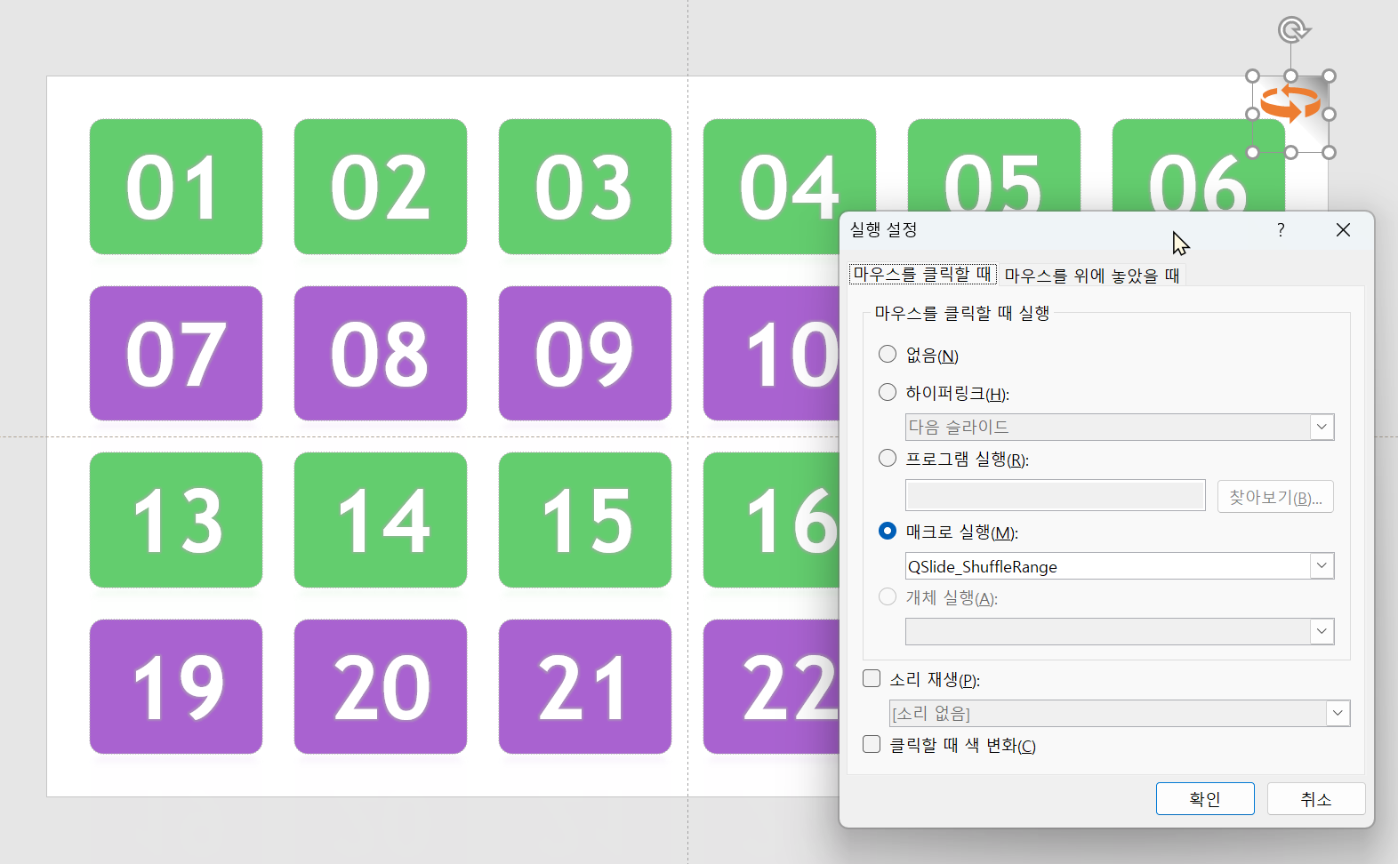 QSlide_ShffleRange는 문제 슬라이드의 순서를 섞어줍니다. 문제번호도 수정합니다.