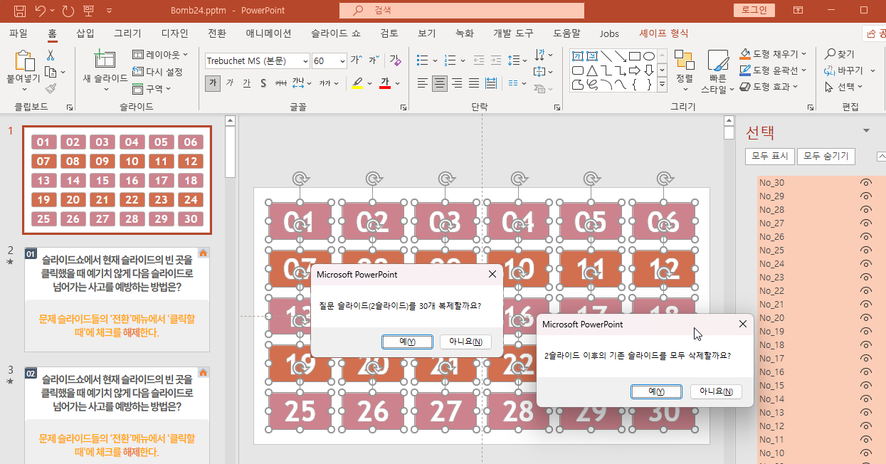 ● 그러면 1슬라이드에는 번호 도형을 생성하고 2슬라이드를 문제수만큼 복제하여 문제 슬라이드도 자동 생성해줍니다. (기존 번호 도형과 문제 슬라이드는 삭제합니다.)