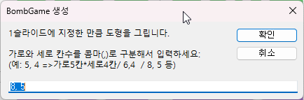 ● 만들고 싶은 가로열과 세로행수를 콤마로 구분해서 6,4 또는 5,5 처럼 입력합니다.