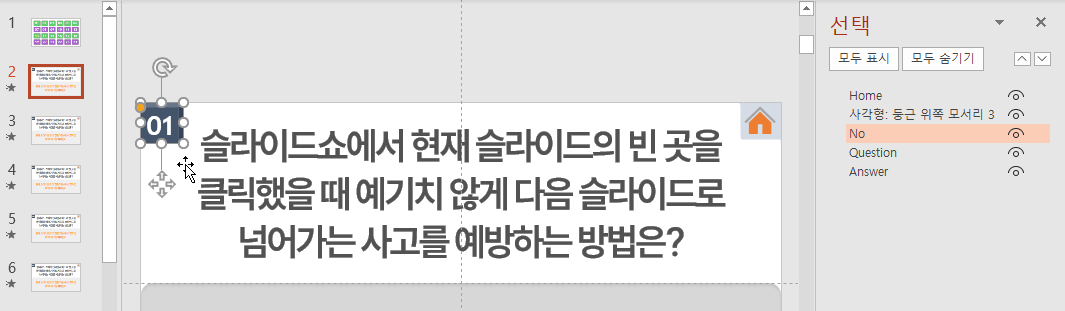 ● 2슬라이드에 문제 슬라이드를 만들고 문제슬라이드에 번호도형을 'No' 라는 이름으로 만들어 놓습니다.