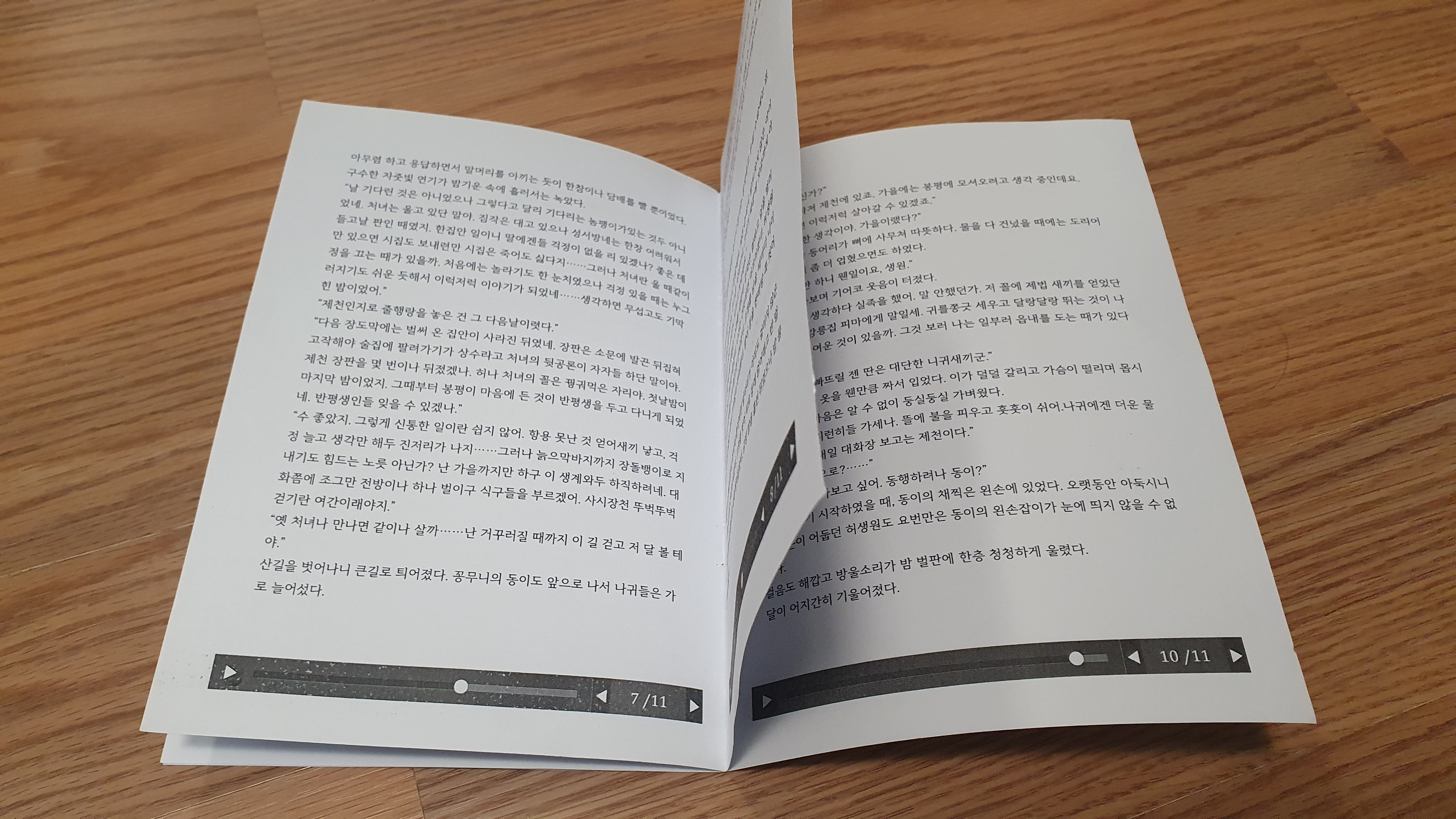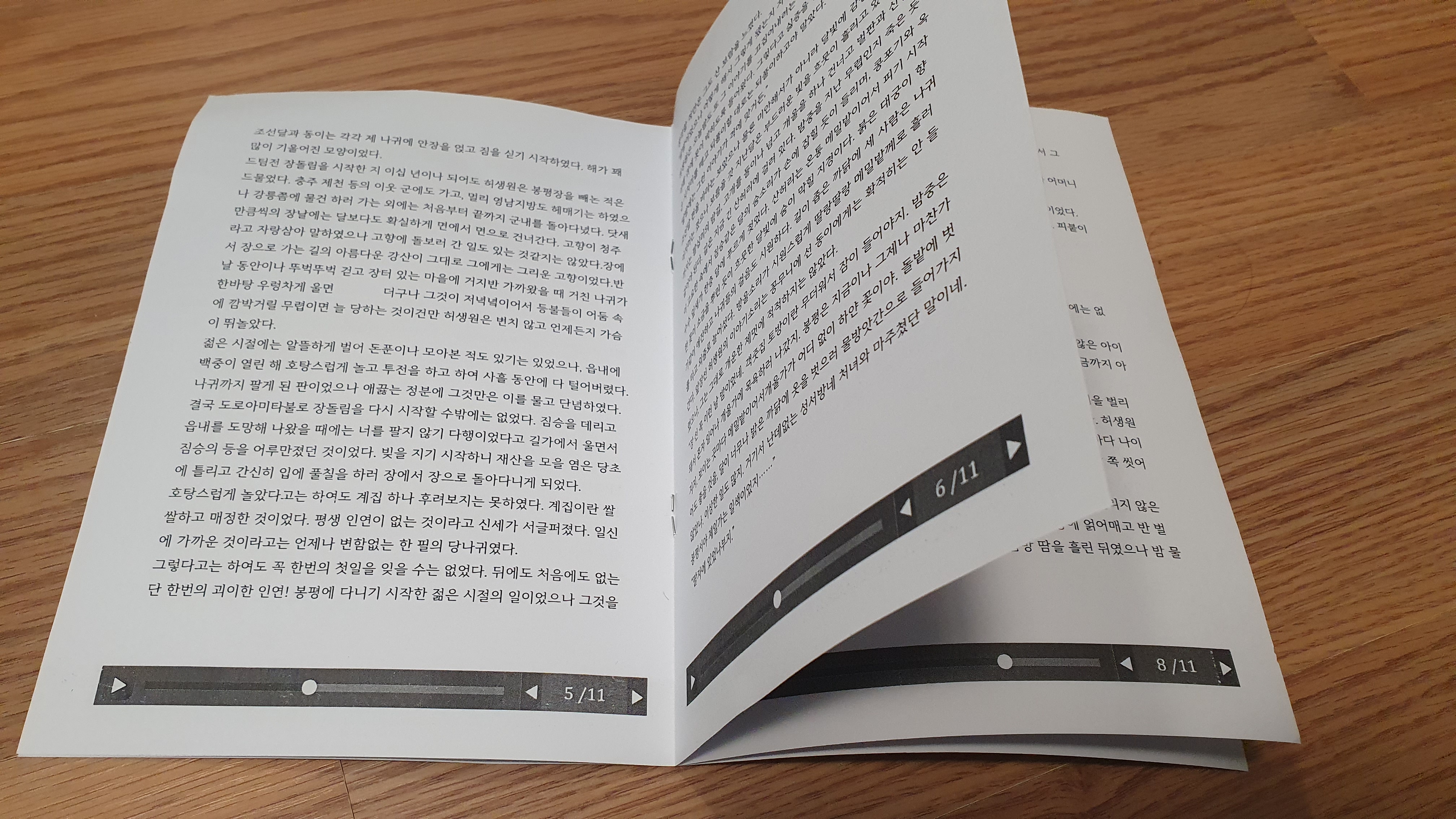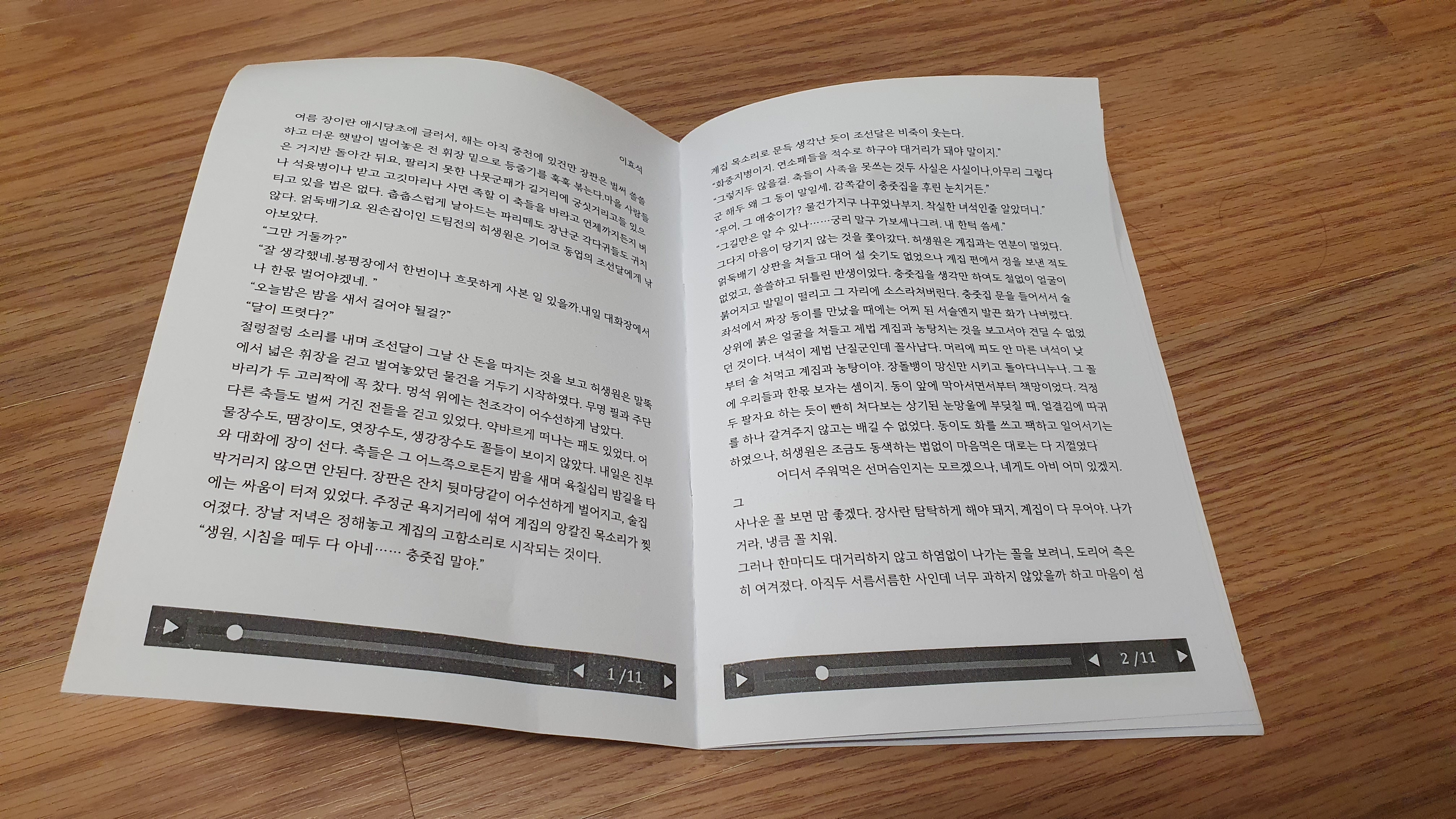 다음 사진들은 '메밀꽃 필 무렵'이라는 단편소설을 위 기능을 이용하여 소책자로 만들어본 것입니다.