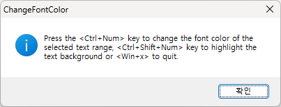 MsgBox, 0x40, ChangeFontColor, Press the <Ctrl+Num> key to change the font color of the selected text range,
