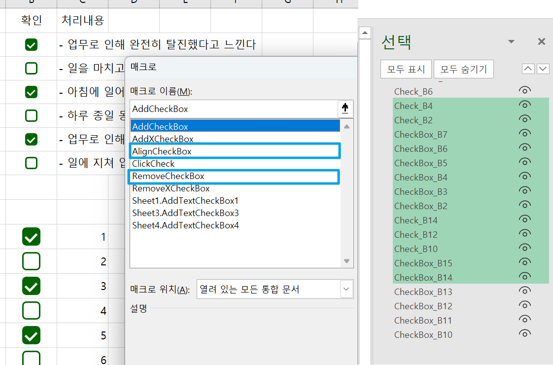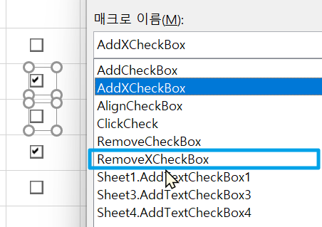 체크박스가 추가되면 Alt+F10 선택창에 네모 도형이 생기고 체크를 하면 체크도형(L자 도형)이 추가되고 RemoveCheckBox로 삭제하면 체크 둥근네모와 체크 도형들이 삭제됩니다. 이 도형들을 마우스 우클릭으로 클릭해서 삭제해도 되고 디자인 모드에서 드래그로 선택해서 삭제해도 됩니다.