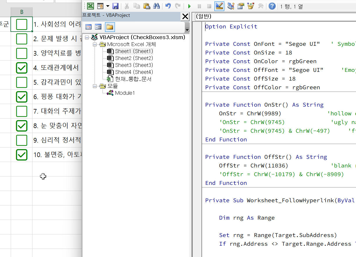 VBA로 이 새로운 체크박스를 체크 혹은 해제하거나 새롭게 추가하거나 삭제하려면 아래 코드를 참고하세요.