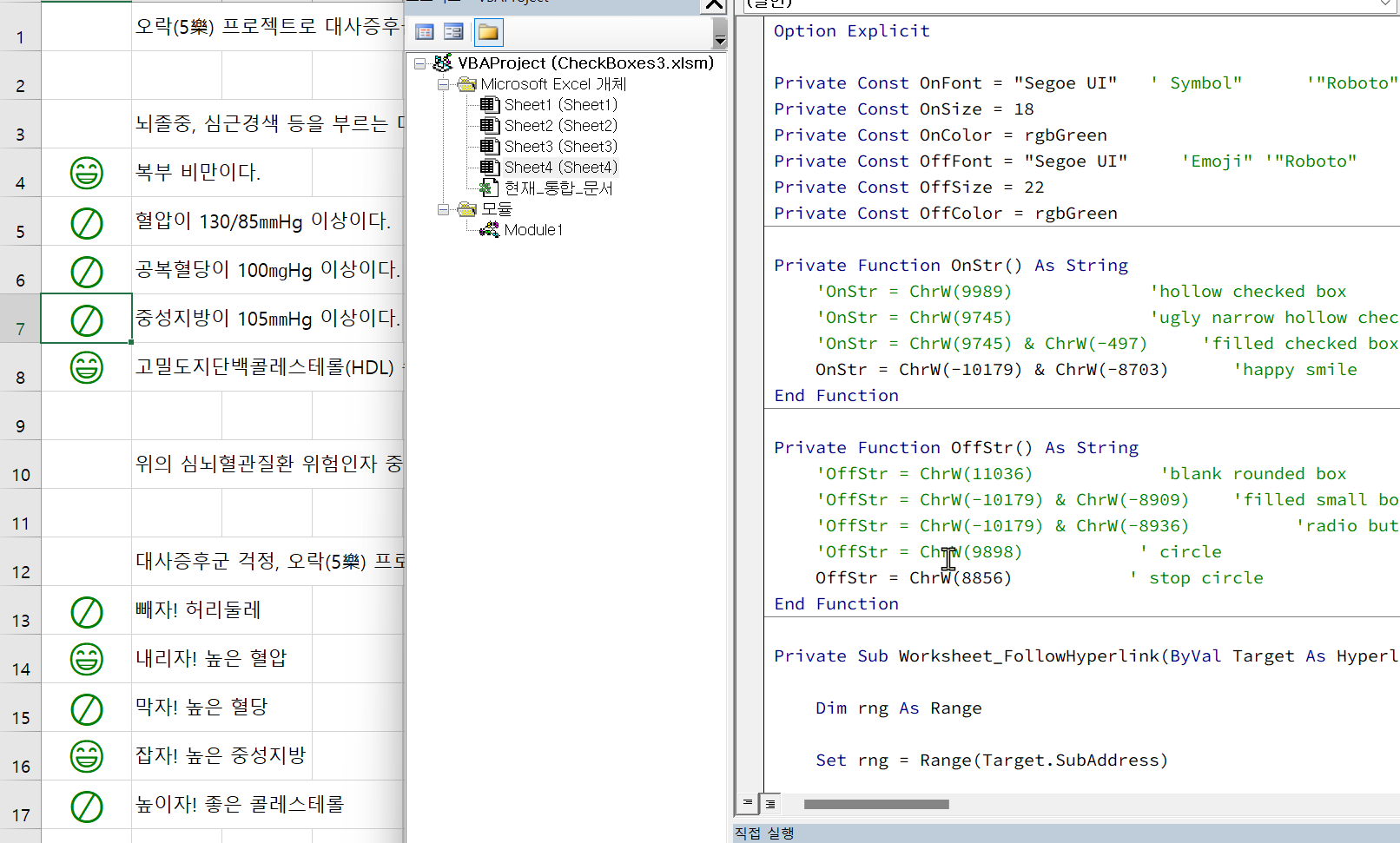 Sheet1 , Sheet3, Sheet4의 문자가 서로 다릅니다. 체크모양의 이모지 문자는 링크에서 찾아보세요.