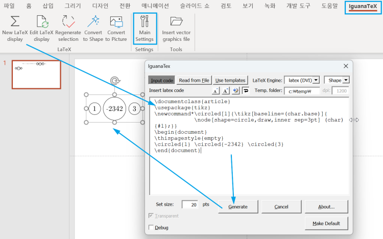 IguanaTex 같은 추가기능을 설치하고(MikTex, GhostScript, ImageMagick, Tex2Img 등을 설치하고 Main Setting에서 경로 설정) 아래 명령으로 원문자를 만들고 수식을 이미지나 도형으로 변환할 수 있습니다.