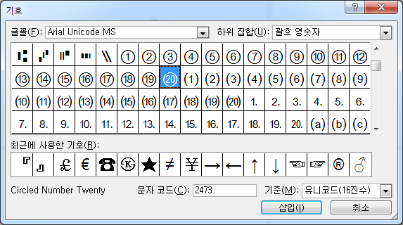 문자코드에 2473 등을 입력하면 원문자 20을 넣을 수 있습니다.