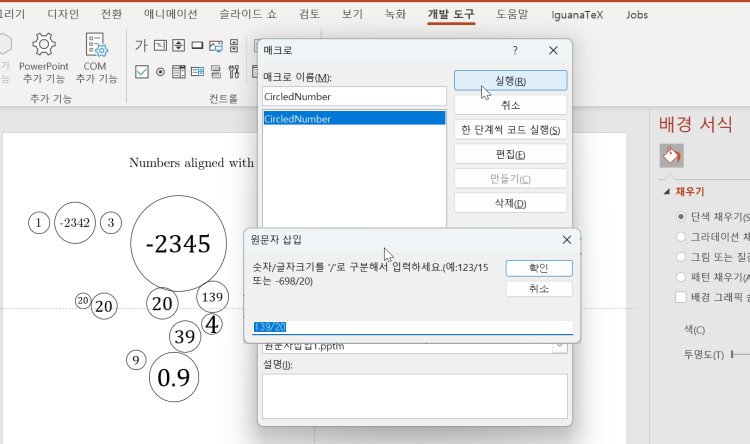 VBA로 숫자와 글자크기를 '20/30' 처럼 입력하면 원도형에 지정된 숫자(20)를 지정된 글자크기(30)로 자동으로 넣어주도록 해보았습니다.