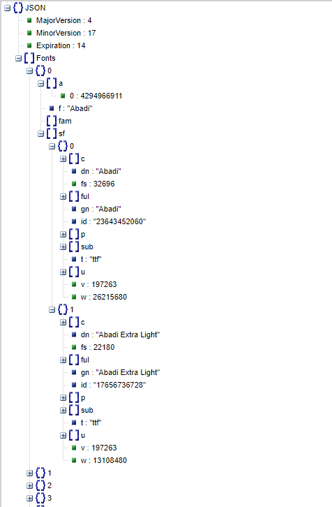 또한 C:\Users\<user name>\AppData\Local\Microsoft\FontCache\4\Catalog\ListAll.json 파일로 아래와 같은 트리구조로 클라우드 폰트 목록이 존재합니다.