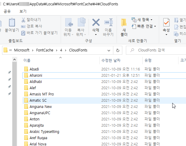 참고로 클라우드 폰트들은 아래 폴더에 숨김 속성으로 저장되어집니다.