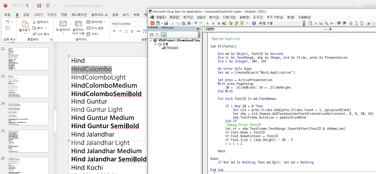 실행하면 아래처럼 여러 슬라이드에 걸쳐 시스템의 모든 폰트목록을 해당폰트를 사용해서 보여줍니다.
