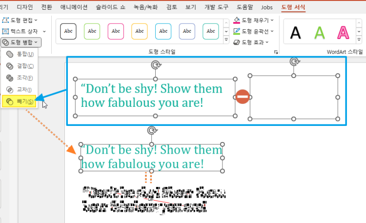 그 방법은 바로 텍스트 상자에서 임의의 빈 텍스트상자를 도형병합(빼기)를 하는 방법입니다.