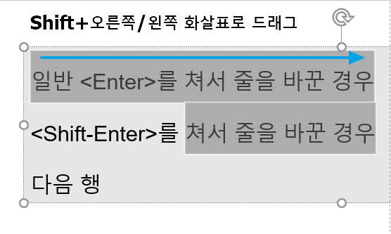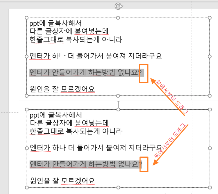 텍스트를 드래그할 때 앞에서부터 하지 않고 뒤에서부터 드래그하는 방법입니다.