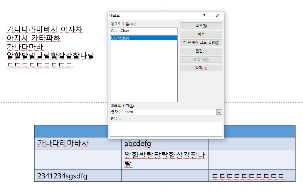 파워포인트의 모든 슬라이드에 사용된 글자의 통계를 내는 매크로입니다.