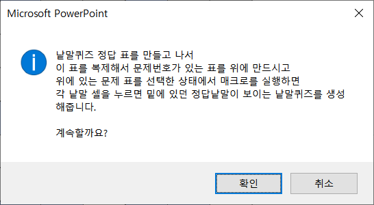 Auto낱말퀴즈만들기 매크로를 실행하면 아래와 같은 메시지가 뜹니다.