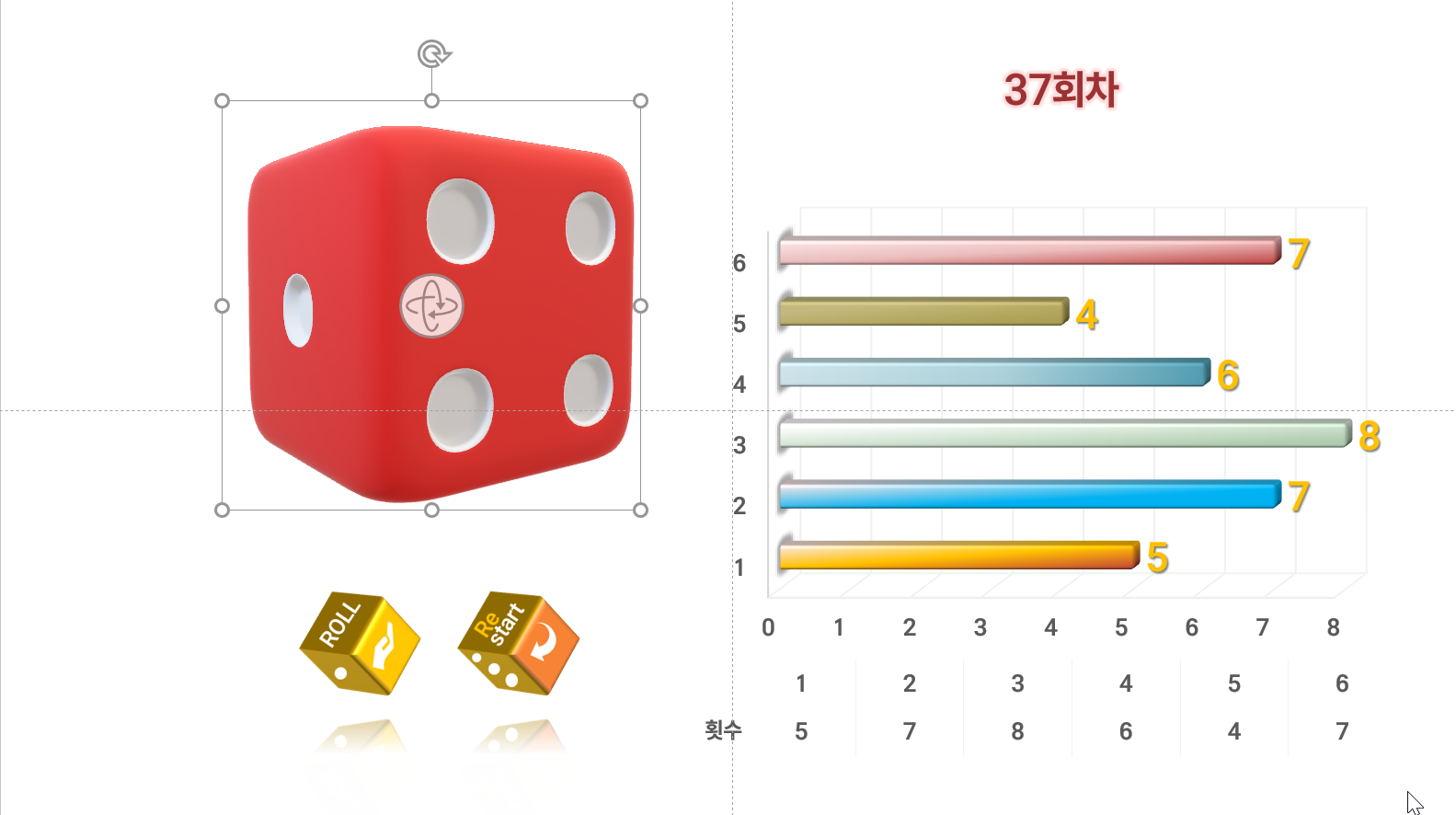 그러면 랜덤으로 3D 주사위가 뜨면서 주사위 눈이 나타납니다.
