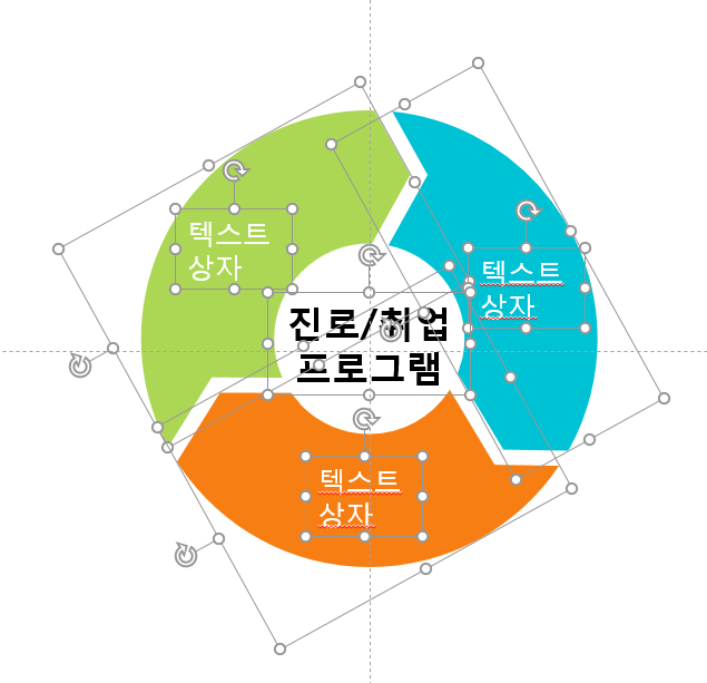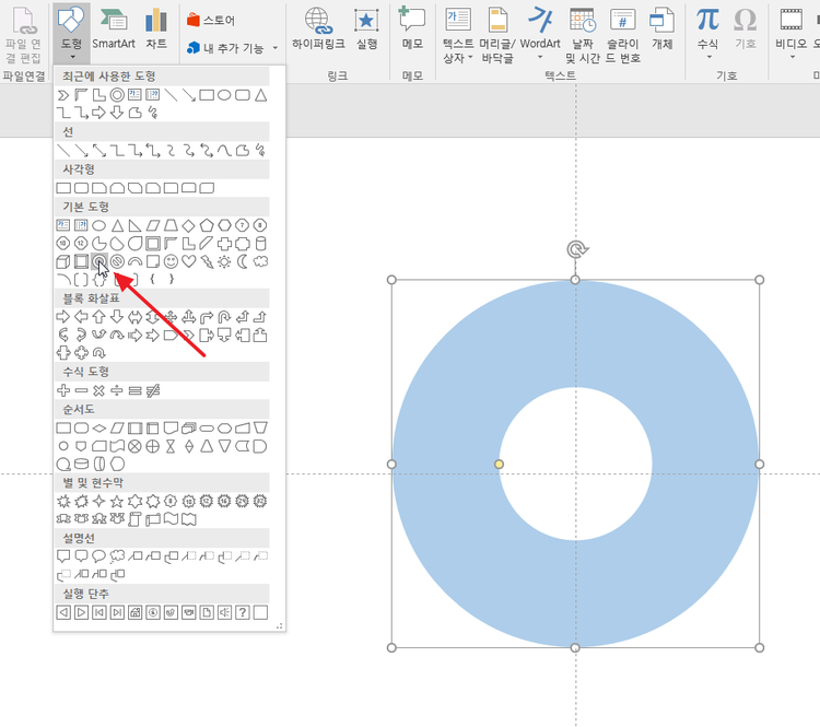 도넛도형이 슬라이드의 중앙에 오도록 더 큰 투명 원도형과 그룹으로 묶어주었습니다.