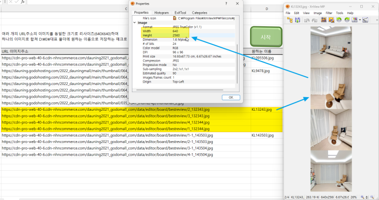 여러 개의 URL주소의 이미지를 동일한 크기로 리사이즈(640X640)하여 또는 동일한 가로사이즈(640px)로 조절하여 하나의 긴 세로 이미지로 합쳐서 D:\E\대표 폴더에 원하는 이름으로 저장하는 매크로 만들수 있는지요? |