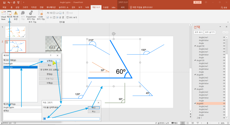 Alt-F8누르거나 개발도구 - 매크로로 DrawAngle 매크로를 실행하세요.