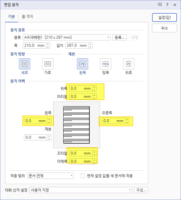 1.편집 용지(F7) 머리말/꼬리말, 위/아래, 좌/우 여백 0으로
