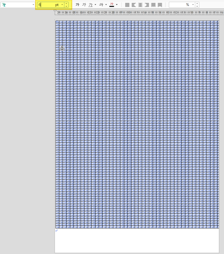 3. 만들어진 표의 첫번째 셀에 들어가서 F5키를 두 번 누르고 End 키 그리고 PgDn 키로 모든 셀 선택 후