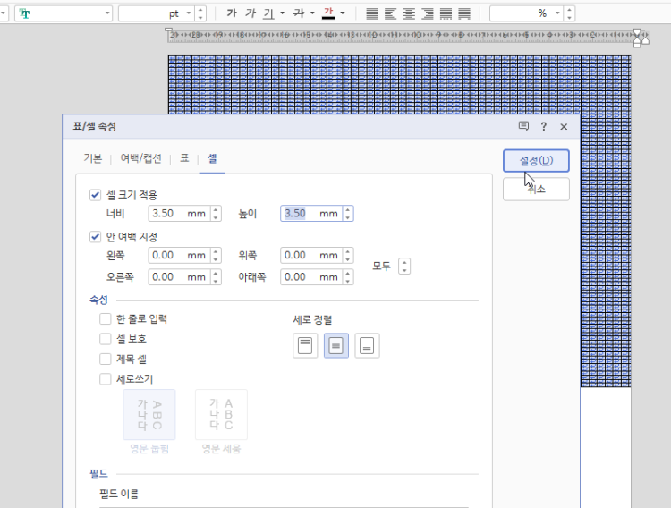 4-3 마지막으로 셀 속성에서 셀크기 다시 적용, 안 여백 0으로 설정